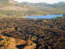The irregularly-shaped lake lies at the northern end of Cinder Cone and the Fantastic Lava Beds, which is a complex of lava flows and a cinder cone. Lava from Cinder Cone's 1666 eruption flowed into and around the lake.[1] This formed an underwater lava field. Water from Snag Lake to the south flows through the porous lava field to Butte Lake.[2] Water from Butte Lake drains via Butte Creek, which flows north out of the parkland.