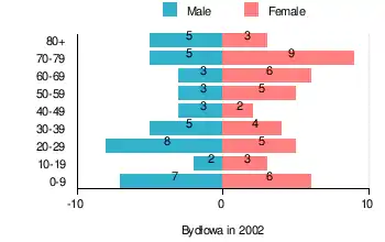 According to the 2002 Poland census, there were 84 people residing in Bydłowa village, of whom 48.8% were male and 51.2% were female. In the village, the population was spread out, with 21.4% under the age of 18, 27.4% from 18 to 44, 17.9% from 45 to 64, and 33.3% who were 65 years of age or older.[1]