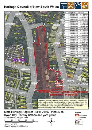 - 1 2 3 4 "Byron Bay Railway Station and yard group". New South Wales State Heritage Register. Department of Planning & Environment. H01107. Retrieved 2 June 2018.