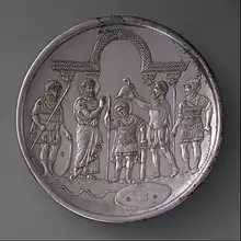 Heraclius was fortunately warned in time and managed to escape, chased by the Avars all the way to Constantinople. However, many members of his court, as well as an alleged 70,000 Thracian peasants who came to see their Emperor, were captured and killed by the Khagan's men.[102] Despite this treachery, Heraclius was forced to give the Avars a subsidy of 200,000 solidi along with his illegitimate son John Athalarichos, his nephew Stephen, and the illegitimate son of the patrician Bonus as hostages in return for peace. This left him more able to focus his war effort completely on the Persians.[101][103]