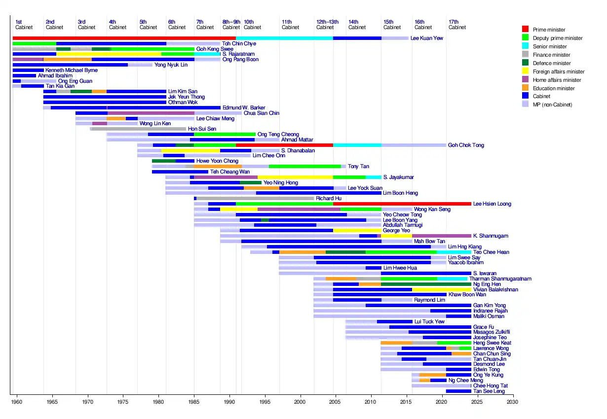 The following is a list of the members of the Cabinet of Singapore since the 1959 Singaporean general election. Members ranked first have held either the office of prime minister, deputy prime minister, senior minister or principal cabinet portfolios (finance, defence, foreign affairs and home affairs). This list excludes ministers of state and parliamentary secretaries.