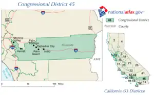 From 2003 to 2013, this district was based in Riverside County. The district included the communities of Palm Springs, Moreno Valley, Palm Desert, Hemet, Cathedral City, Temecula, Blythe, Rancho Mirage, Murrieta, Indio, Indian Wells, La Quinta, Cabazon, Anza, Thermal, Idyllwild, Coachella, and other unincorporated areas of Riverside County.