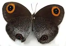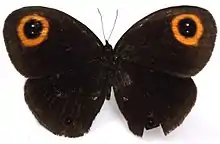 Upperside: Ground colour dark chocolate brown, slightly blackish, paler towards margins. Very large round orange-ringed apical ocellus (11mm), black inner with two white pupils. Edges of ring distinct and regular. Hindwing single tornal ocellus in space 2. Narrow reddish ring, black inner and white pupil.