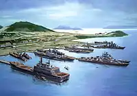 Historically, the bay has been significant from a military standpoint. The French used it as a naval base for their forces in Indochina. It was also used as a staging area for the 40-ship Imperial Russian fleet under Admiral Zinovy Rozhestvensky prior to the Battle of Tsushima in 1905,[3] and by the Japanese Imperial Navy in preparation for the invasion of British Malaya and British Borneo (today Malaysia) in 1942. In January 1945 U.S. Naval Task Force 38 destroyed most Japanese facilities in an action called Operation Gratitude,[4] after which the bay was abandoned.