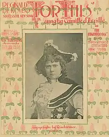 In London D'Arville was associated with the Gaiety Theatre; she appeared in the shows La Vie, Chilperic, Rip Van Winkle, Falka, Mynheer Jan, Carina, and Cymbria, among others. She moved to the United States in 1888.[3] Her stage appearances included roles in The Queen's Mate (1888), Venus (1893), Oscar Hammerstein I's Santa Maria (1896), The Belle of London Town (1907), A Daughter of the Revolution, The Bohemian Girl, Robin Hood, Madeleine, The Highwayman, and The Mascotte.[4][5] She was associated with the Bostonians light opera company for some of these shows.[2] She was known for "cavalier" parts, in which female characters were disguised in masculine hat, tunic, boots, and tights for part of the show.[6]"She wears a military costume which is charmingly becoming to her, also a short curly blond wig," one reviewer noted.[7] In 1894, she headed the Camille D'Arville Light Opera Company.[8] She retired from the stage after 1908, though she had announced an intention to retire after her second marriage as early as 1900, writing "I believe that any other woman who pursues a profession after her marriage makes a miserable failure of it."[9]
