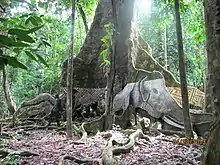 Campo Ma'an National Park is biodiversity hotspot, with a wide range of plant and animal species, including several taxonomic endemics.[6] Mammal species include forest elephants, duikers, hippos, bush pigs, giant pangolins, black colobus, mandrills and leopards.[8][9] A small population of forest buffalo reside in the southern area of the park.[2] Campo Ma'an National Park harbours populations of critically endangered western lowland gorilla and endangered central chimpanzee.[1] The area is considered a priority landscape for conservation of western lowland gorillas and central chimpanzees by the IUCN[10] and the park is the site of an ongoing gorilla habituation project.[11] Reptile species reported are 122, and fish species are 165. A survey of millipedes, conducted in 2015, reports 27 species in the Campo Ma'an National Park, the most abundant being Aporodesmus gabonicus.[12] It is also one of the 33 bird identified areas in the southwestern corner of Cameroon, and has more than 300 bird species.[13][14] The forest type is mainly closed evergreen canopy, and is described as Atlantic Biafran forest with many plant species in the Caesalpiniaceae family.[12][6][15] There are 29 species of plants occurring uniquely within park boundaries.[16] A rare and critically endangered orchid from the genus Distylodon was discovered in the nearby village of Bifa; assessments are ongoing to detect further occurrence of this species within the protected area.[17] Total plant species are reported at 256, with 22 listed as endangered by the IUCN. The forest region containing the Campo Ma'an National Park is believed to have persisted as a tropical rainforest throughout the Pleistocene era, based on the distribution of slowly dispersing plants species and high degrees of endemism.[15] Selective logging took place in 1994–1995, leaving logging roads through the reserve area.[2][1] The park is subject to many threats to its ecosystem, mainly due to logging, poaching, agricultural activities and coastal development.[11] Construction of the Memve’ele hydroelectric dam and the Kribi deep-sea port represent additional threats to the biodiversity of the region.[10] Due to the high biodiversity and need for continued and sustainable conservation, Campo Ma'an has been proposed as a pilot ecotourism site.[18]