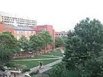 Midcampus is a central area of the main campus located between 21st & 22nd Streets and G & H Streets. There are three 'gated' entrances to Midcampus located on 21st, 22nd, and H Streets. Kogan Plaza, located at the Trustees Gate on H Street, is used as a gathering place for students, for social purposes, demonstrations, barbecues, or student organization fairs, among other purposes. Kogan is surrounded by Lisner Auditorium, Gelman Library, and other buildings. It sits across H Street from the District House residence hall (formerly 'Schenley' and 'Crawford' residence halls), as well as the Marvin Center. The Monroe Court is a landscaped area with cherry trees and a central fountain, located near Hall of Government and Monroe Hall, just off Midcampus Walk.