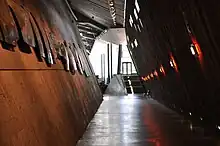 The interior walls of the building are primarily made out of concrete that incorporates up to 15 per cent recycled fly ash, making the walls of the building a large energy-conserving mass.[29] The walls are designed to emerge sharply from the ground, in an unusual fashion; whereas the floors were designed with slight slopes within them.[26] Together, these design features are intended to evoke the feeling of instability with the museum's visitors.[26] All the galleries within the building include ramps and slopes, making all exhibits in the museum wheelchair accessible.[26]