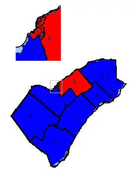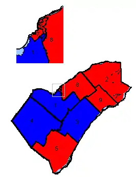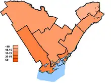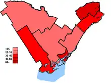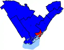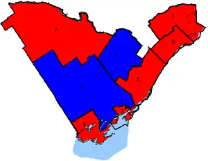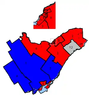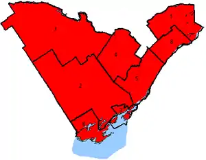 ![]() Map of the region's ridings in 1958. Colours show the result from the 1958 election |