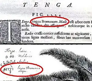 This book also contains the Konkani names of each plant, tree and creeper are also included throughout the book, in all 12 volumes, both in its descriptive parts and alongside their respective drawings. While the names are in Roman script in the descriptive part, the names alongside the diagrams are in original Nāgarī script itself, indicated as Bramanical characters.[14]