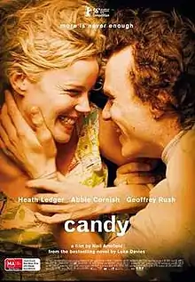 Candy is a 2006 Australian romantic drama film, adapted from Luke Davies's 1998 novel Candy: A Novel of Love and Addiction. Candy was directed by debut filmmaker Neil Armfield and stars Heath Ledger, Abbie Cornish and Geoffrey Rush.