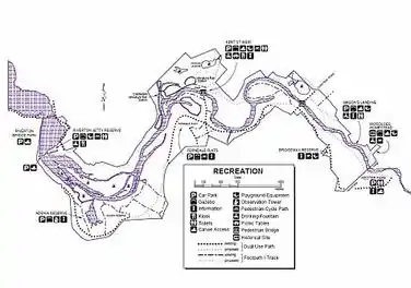Access throughout the park is offered by either dual use paths or walk tracks, with the emphasis being on the enjoyment of the surrounding nature. Four marked interpretive walk trails traverse the park: (1) Butterflies, Birds and Bridges Loop, (2) Woodloes Walk, (3) Banksia Hill Loop, and (4) Lagoon to Living Streams.[1] The local council (the City of Canning) and the Department of Environment and Conservation (DEC) are responsible for providing well designed recreation areas without detracting from the natural values of the park.