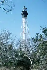 Cape Charles Lighthouse is an octagonal cast iron skeleton tower lighthouse at the mouth of the Chesapeake Bay on Smith Island which was officially removed from service in 2019.[3][4][5][6] It is the tallest lighthouse in Virginia and the second tallest in the United States.[5] This particular tower is the third lighthouse at this location. The first lighthouse at Cape Charles was a 55-foot (17 m) masonry tower completed in 1828. It was quickly deemed inadequate for its important seacoast location due to its low height and poor visibility at sea. It was soon threatened by erosion so in 1864 it was replaced by a 150-foot (46 m) masonry tower built further inland. Located a little more than a mile southwest of the old tower and 600 feet from the shoreline, the impressive 150-foot-tall conical brick tower was similar in appearance to the 1857 Cape May Lighthouse, painted white and topped with a dark brown lantern room. In 1892, a twenty-five-foot red band was painted around the white tower's midsection, about sixty feet up from the base, to make it more visible during the day. By the 1890s, it too was threatened by beach erosion which jetties built to protect it failed to halt, and with the lighthouse now only 300 feet from the ocean and the shoreline eroding at a rate of 37 feet per year it was decided that a third lighthouse needed to be built three quarters of a mile inland.