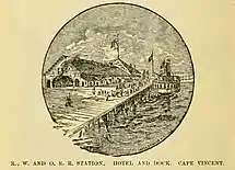 Beginning in April 1852, the Cape Vincent branch of the Rome, Watertown & Ogdensburg Railroad (RW&O) conveyed both passengers and freight between the waterfront and Watertown (and on to Rome) via Chaumont and Brownville. The Watertown-Cape Vincent branch was a vital link from the southern part of the state to the ferry terminal to Canada. However, its importance was reduced with the company's acquisition of the Utica & Black River Railroad (with its depot in Clayton) in 1886. By 1891 the railroad became a subsidiary of the New York Central Railroad. In 1895, a storm blew down the Cape Vincent station building, killing two inside.