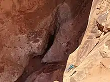 One of the most popular canyoneering routes in Capitol Reef National Park is Cassidy Arch Canyon. A paper by George Huddart, details the park's commitment to working with citizens to maintain the route as well as the vegetation and rocks.[38] The canyon route is approximately 2.3 miles long (0.4 miles of technical work), consisting of 8 different rappels, and takes between 2.5 and 4.5 hours to complete.[39] The first rappel is 140 ft and descends below the famous Cassidy Arch.[40]