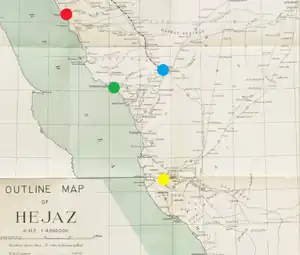 ![]() Contemporary British map of Hejaz marked with the locations of Wejh (red), Yenbo (green), Medina (blue) and Mecca (yellow) | |||||||