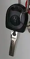 A car key or an automobile key is a key used to open and/or start an automobile. Modern key designs are usually symmetrical, and some use grooves on both sides, rather than a cut edge, to actuate the lock. It has multiple uses for the automobile with which it was sold. A car key can open the doors, as well as start the ignition, open the glove compartment and also open the trunk (boot) of the car. Some cars come with an additional key known as a valet key that starts the ignition and opens the driver's side door, but prevents the valet from gaining access to valuables that are located in the trunk or the glove box. Some valet keys, particularly those to high-performance vehicles, go so far as to restrict the engine's power output to prevent joyriding.[1] Recently, features such as coded immobilizers have been implemented in newer vehicles. More sophisticated systems make ignition dependent on electronic devices, rather than the mechanical keyswitch. A number of these systems, such as KeeLoq and Megamos Crypto have been demonstrated to be weak and vulnerable to cryptanalytic attacks.[2]