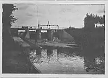 After arriving at the camp, the prisoners were selected: those capable of working, aged 14 to 60, were taken to forced labor, the sick, the elderly and women with children were detained in the camp. The prisoners lived in three unheated factory warehouses, in a brick shed and in a barn together with the cattle. They slept on a concrete floor. Babies were given a cup of skim milk once a week.[10] Extremely hard work was a daily task: in particular, prisoners took over the rebuilding of the water dam destroyed by retreating Poles.[11] With the camp located on both sides of the Brda River, the exhausted prisoners had to travel about a kilometer in order to get to the canteen.[12]
