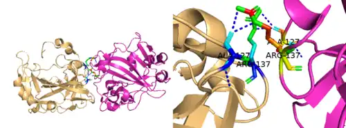 Under physiological conditions, the enzyme exists as two nearly identical dimers.[14] Both dimers are stabilized by two hydrogen bonds between Arg-137 and the Ala-127 carbonyl oxygen as well as many Van der Waals interactions.[14] One dimer, however, has additional stabilization due to a disulfide bridge formed by two cysteine residues.[14]