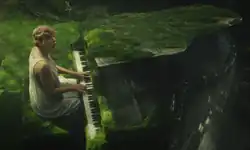 An official music video for "Cardigan"—written, directed, and styled by Swift—was released alongside the album on July 24, 2020.[10] The "homespun" and "dreamlike" video starts out with Swift sitting in a candlelit cottage in the woods, wearing a nightgown and playing a vintage upright piano. This scene also features a photograph of Swift's grandfather, Dean, who fought in the Battle of Guadalcanal, and a painting that she created during the first week of COVID-19 isolation.[59] When the soundboard emanates golden sparkles, she climbs into it and finds herself magically transported to a moss-covered forest, where she plays the song on a grand piano producing a waterfall.[60][61]