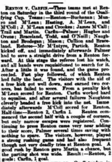 Rovers only had one more season in senior football, and beat Uddingston in the second round in the Qualifying Cup (after walking over a "non est" Blantyre),[7] but lost at Renton in the third, when a win would have put the club into the Scottish Cup proper; Carfin was reckoned without a chance before the game,[8] but nearly caused a great shock, the balance of play favouring a draw.[9] However Carfin lost to East Lanarkshire in its first round Lanarkshire Cup tie, the blame in part being put on a decision to go to Harthill by brake in windy conditions, which left the team not only unfit, but at a disadvantage in gauging the effect of the wind on an exposed and unfamiliar ground.[10] The E.L. repeated the result when the clubs met in the Consolation Cup.[11]