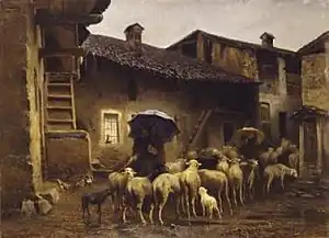 From 1858 to 1860, he lived in Paris, where he became familiar with the works of Camille Corot and Charles Jacque.[2] He also came under the influence of the Barbizon school. After that, he spent three years in Rome. Later, he became the leader of a group of landscape painters who met during the summers near Rivara, in the Canavese, to paint "en plein aire".[3] This group consisted of artists who worked in both the Romantic and Realistic styles, including Ernesto Bertea, Alberto Issel, Serafín Avendaño, Ernesto Rayper and Federigo Pastoris: referred to as the "Scuola di Rivara". Some were also members of a group known as the "Scuola grigia", centered in Liguria.