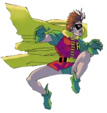 Carrie Kelley is a 13-year-old schoolgirl and scout whom Batman saves from a sadistic group of Mutant gang members on the night of his return from retirement. Idolizing the Dark Knight, she then spends her lunch money on a Robin outfit, sets out to attack petty con-men and to find Batman in the hope of becoming his partner. Kelley uses a slingshot and firecrackers as weapons. She also wears green-tinted sunglasses instead of a black domino mask. Prior to her beginning her training from Batman, she is already trained in gymnastics. Like most of the young characters in the book, she speaks in a futuristic slang that Miller credited colorist (and Miller's wife) Lynn Varley with helping to create.[3]
