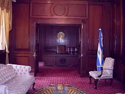 Every president who governed from this mansion has tried to give it a personal touch, such as remodeling the building, changing the carpets or the wallpaper, or acquiring an art object to add to the collection. Some adornments and elements of the current rooms belonged to the former presidential houses. Among these are the Victorian era mirrors that adorn the Hall of Honor. Also, the collection of paintings that decorate the main halls were painted between 1957 and 1959 by the Chilean artist Luis Vergara Ahumada, with the historical guidance of Professor Jorge Lardé y Larín. They were painted during the administration of Lieutenant Colonel José María Lemus. The remodeling works completed during the administration of Dr. Armando Calderón Sol, were coordinated by the private secretary of the presidency, Ángel Benjamín Cestoni and supervised by the interior designer María Eugenia Perla. Earthquakes in January and February 2001 severely damaged the location and President Francisco Flores authorized the relocation of Casa Presidencial offices to their current location in San Benito. The photos on this page are from the new and current location.