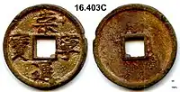 The Tang dynasty introduced the Kaiyuan Tongbao,[14] which would influence the inscriptions of cash coins, both inside and outside of China, minted from this period onwards.[15][16][17]