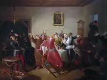 In October his responsibilities in the War Council were increased, and the same month he became involved with the plan to kidnap King Poniatowski.[15] Pulaski was initially opposed to this plan but later supported it on the condition that the king would not be harmed.[16] The attempt failed, weakening the international reputation of the Confederates. When Pulaski's involvement with the attempted kidnapping became known, the Austrians expelled him from their territories.[15][17] He spent the following winter and spring in Częstochowa, during which time several of his followers were defeated, captured or killed.[15]