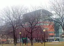The Cass Park Historic District includes Cass Park, a formal square with angled paths and scattered statues,[4] as well as various commercial headquarters buildings, apartment buildings, the monumental Detroit Masonic Temple and other structures surrounding the park.[5] Cass Park is a landscaped green space, containing abundant trees, park benches and modern, multi-color playground equipment. A fountain was once in the center of the park. A statue of Robert Burns, sculpted by George Anderson Lawson in 1921, is located at the north side of the park, facing the Masonic Temple. The new Cass Technical High School is located just to the south of the park, and various other buildings, all of which are contained within this historic district, surround and frame the park space.[2]