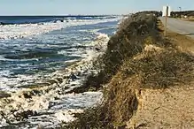 Caswell Beach slowly developed into a vacation resort community,[8] but was plagued over the years by the incessant erosion of beach sand due to hurricanes and nor-easters. This erosion threatened the town's main thoroughfare (Caswell Beach Rd) and made uninhabitable many ocean front houses. Installation of roadside sandbags provided temporary relief and its success prompted the town to set in motion an intensive restoration and preservation effort focused on installing sand fences and planting sea oats/beach grass. This work was abetted by the Wilmington Harbor Channel Project, which dumped huge amounts of sand on the beach as a least cost disposal option.[9] This effort was very successful and widely recognized as the town received a national award in 2002 for Best Restored Beach.[10]