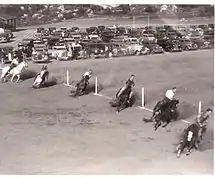 Cate's total enrollment had increased to 40 in 1919,[12] and the school finally had enough boys to field athletic teams to compete with other private schools in the area. The first and most obvious of these was the Thacher School, which would become the traditional arch-rivalry of both schools. Cate and Thacher competed in baseball in Cate's first academic year despite the former's meager enrollment, and Cate lost the game 60-4. Cate recorded its first win in baseball over Thacher in 1921 thanks to the surge of enrollment following World War I.[12] Perhaps the most important competitive event between the two schools, however, was gymkhana. Gymkhana, an equestrian event, involved a multitude of events such as picking up an orange or a sack on a turn at a dead run, tilting at rings, sprints, and relays. In contrast to their shortcomings on the baseball field, Cate posted an all-time winning record of 15-9 over Thacher in the 24 gymkhana competitions held.[9] The geographic locations of Cate and Thacher, their eventual status as the two premier boarding schools of the west,[13] and the competitiveness of their early baseball and equestrian competitions likely contributed to the rivalry as it stands today over 100 years later.