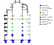 The Hostienmühle window was built between 1448 and 1453 and was funded by the city of Bern. The Three Kings window was built between 1447 and 1455 for Rudolf von Ringoltingen, possibly in Constance or the Oberrhein region. The Bible scenes window was originally supposed to be just of the young Christ but was changed after 1447. It was built between 1448 and 1451 and was funded by three members of the Gesellschaft zum Mittellöwen. The Passion window was built between 1438 and 1441. Only 21 panels of the original window remain.[18] It was built for the city through the Schultheiß by Hans Acker in Ulm. The Ten thousand martyrs window was originally supposed to be of the Resurrection of Jesus, but that was changed after 1447. It was built between 1447 and 1449 and was funded by donations from the citizens of Bern. It was built by Master Painter Bernhart and glazier Niklaus Magerfritz in Bern. The Ten thousand martyrs window was replaced in 1868 by the Christ window. The Stephanus window replaced an earlier window in 1868. The theme of the original window is unknown but it was built in 1449–1451 for Kaspar von Scharnachtal, probably by Niklaus Magerfritz in Bern. The Coat of Arms window was built in 1820–30 to replace an earlier, unknown window.[19]