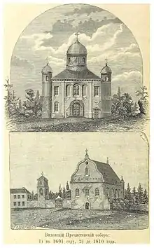 The cathedral was built during the reign of the Grand Duke of Lithuania Algirdas for his Orthodox second wife Uliana of Tver in 1346.[1] It was constructed by Kievan architects with the blessing of Saint Alexius, Metropolitan of Kiev and all Rus', in 1348.