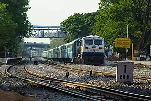- YP#2225 departs Cavalry Barracks in the Hyderabad suburban area with long distance #581 Ajmer-Kacheguda Fast Pass. Cavalry Barracks, 1984-01-03. Photo Credit John Lacey.