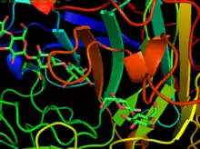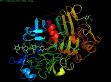 CBH1 from yeast, for example, is composed of a carbohydrate binding site, a linker region and a catalytic domain.[6] Once the cellulose chain is bound, it is strung through a tunnel-shaped active site where the cellulose is broken down into two-sugar segments called cellobiose.[6][7] The structure of the enzyme can be seen in the first figure. The second figure shows the activity of the enzyme, and shows both cellulose binding to the enzyme, as well as the product of this step, cellobiose. Research suggests, however, that the activity of CBH1 is very strong inhibited by the product, cellobiose. Determination of an enzyme that is not as strongly inhibited by the product or finding a way to remove cellobiose from the environment of the enzyme are just more examples of the many challenges that face the use of these enzymes for the creation of biofuels.[8]
