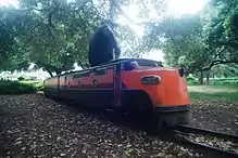 The Bianchi miniature railway, named after its current owner, runs an Arrow Development locomotive on 12-inch (30 cm) gauge track. The Arrow `Streamliner′ locomotive was originally built in 1953 to replace an Ottaway steam locomotive, and was later converted to battery power.[20] Rides are $2 each, and the operator of the train also occasionally opens the snack bar in the Fitzgerald Field grandstands. The miniature train is painted in the Southern Pacific "Daylight" livery, and has been running since May 10, 1948.[9] It can accommodate 10 children.[9]
