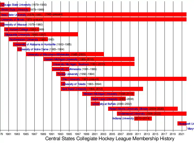 The league began in 1970 with Chicago State University, Illinois State University and Iowa State University as founding members.[1] The following season the league expanded to 24 teams in 3 divisions making the CSCHL the premier ice hockey conference in the midwest. Joining the CSCHL included Bradley University, Drake University, Illinois Benedictine University, Illinois Institute of Technology, Lewis University, Northeastern Illinois University, and Western Illinois University. The University of Illinois joined shortly after in 1974. The league saw great expansion in the early 1990s when the University of Michigan-Dearborn joined after operating as an NAIA varsity program.[1] Ohio University followed in 1993 and Kent State University joined in 1994 after the university dropped NCAA hockey.[1] Following the 2003 season, UW-Whitewater departed & dropped down to play ACHA D2. In 2004, Robert Morris University-Illinois joined the league, followed by Lindenwood University in 2006. After the 2008 season, Saint Louis University departed to play at the ACHA Division II level. At the conclusion of the 2009–2010 season, Eastern Michigan University, Michigan–Dearborn, and Western Michigan University left to join the new Great Lakes Collegiate Hockey League.[2] The CSCHL added Indiana University, who joins the league for the 2010–2011 season, after transitioning from ACHA II.[3] Kent State departed for the GLCHL at the conclusion of the 2011–12 season. Indiana University rejoined the Great Midwest Hockey League (GMHL) in the 2014–15 season to once again compete at the Division II level.[4] During the 2019–20 season, Robert Morris Illinois merged with erstwhile non-hockey Roosevelt University.[5] The hockey program was retained through the merger process of the universities and athletics departments and has played under the Roosevelt Lakers program beginning in the 2020-21 season.[6] After the 2021–22 season, Lindenwood moved up its men's hockey team to NCAA Division I status and therefore left both the league and the ACHA.[7]