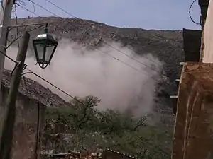 In late 2010 the SEMARNAT issued MSX a new permit, despite strong local opposition, and the mine began operating again.[2][8] 25 tons of explosives are detonated daily, and the namesake hill, Cerro de San Pedro, no longer exists.[2][11][12]