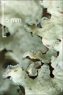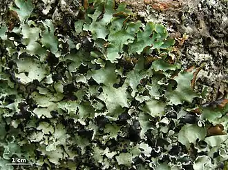 Cetrelia is characterized by its foliose (leafy), greyish-green thallus that is loosely attached to the substrate. The thallus has laminal pseudocyphellae – these are small pores in the cortex through which the medulla is directly visible. It has a prosoplectenchymatous upper cortex, meaning that it is made of densely agglutinated hyphae that are not swollen and have tiny lumina.[20] The lower cortex is black, at least in parts, with sparse rhizines, and pycnidia (asexual fruiting bodies) on the margin. The ascospores made by Cetrelia lichens are colourless with an ellipsoid shape, numbering eight per ascus.[14] Their length ranges from 11 to 22 μm, with a width of 6–12 μm.[20] Conidia (asexual spores that are produced in the pycnidia) are rod-shaped and measure 3–6 μm long.[14]