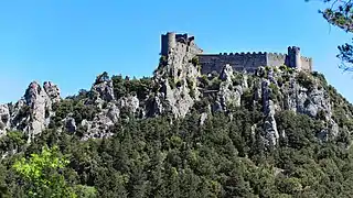 The Château de Puilaurens (Puilaurens Castle, also Puylaurens; in Occitan: lo Castèl de Puèg-Laurenç) is one of the so-called Cathar castles in the commune of Lapradelle-Puilaurens in the Aude département.[1] The castle is located above the Boulzane Valley and the villages of Lapradelle and Puilaurens. There is a path from Axat to the castle.