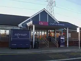 Chafford Hundred railway station,[4][5] also known as Chafford Hundred Lakeside station, is located on a single-track branch line of the London, Tilbury and Southend line, serving the area of Chafford Hundred as well as Lakeside Shopping Centre in Essex. It is 20 miles 77 chains (33.7 km) down the line from London Fenchurch Street via Upminster; it is situated between Ockendon and Grays. Its three-letter station code is CFH.