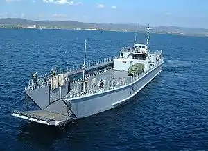 The CDIC landing craft were improved versions of the Engin de débarquement d'infanterie et de chars (EDIC) vessels that had been constructed from the 1950s to the 1980s.[1] They were designed to work with the Foudre-class landing platform dock ships of the French Navy and take infantry and vehicles from the landing platforms to the shore.[2] The landing craft can also be used for coastal transport.,[3] The CDIC vessels have a standard displacement of 390 tonnes (380 long tons) and 760 tonnes (750 long tons) at full load. They are 59.4 metres (194 ft 11 in) long with a beam of 11.9 metres (39 ft 1 in) and a maximum draught of 1.8 metres (5 ft 11 in). The two landing craft are powered by two SACM Uni Diesel UD 30 V12 M1 diesel engines driving two shafts rated at 890 kilowatts (1,200 hp). The CDIC have a maximum speed of 10.5 knots (19 km/h; 12 mph) and a range of 1,000 nmi (1,900 km; 1,200 mi) at 10 knots (19 km/h; 12 mph). The two ships have capacity for 350 t (340 long tons) of stores and room for 230 personnel. They have a complement of 18 including one officer. They mount two 20 mm modèle F2 guns and two 12.7 mm (0.5 in) machine guns. The wheelhouse can be lowered so that the vessels can dock more easily.[2]