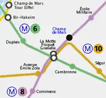 Champ de Mars (French pronunciation: [ʃɑ̃ d(ə) maʁs]) is a ghost station on line 8 of the Paris Métro, between the stations of La Motte-Picquet–Grenelle and École Militaire. It is situated in the 7th arrondissement of Paris, to the southwest of Champ de Mars, a public garden, of which it is named after.