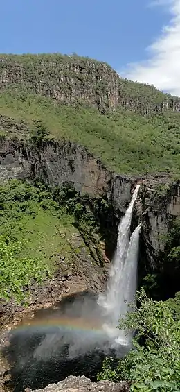 The main river in the park is the Rio Preto, a tributary of the Tocantins River.[2] There are many waterfalls along its course such as the Rio Preto Falls (120 meters high, 80 meters at the base) and the Cariocas Falls. The park is noted for its scenic canyons, with walls of up to 40 metres (130 ft) high and valleys of up to 300 square metres (3,200 sq ft) deep.
