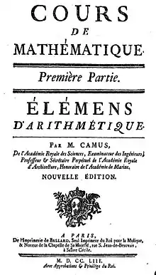 - ↑ One or more of the preceding sentences incorporates text from a publication now in the public domain: Chisholm, Hugh, ed. (1911). "Camus, Charles Étienne Louis". Encyclopædia Britannica. Vol. 5 (11th ed.). Cambridge University Press. p. 140.