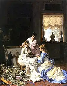 Baugniet settled in Paris in 1860. Almost overnight the invention and development of photography strangled the traditional market of lithographic portraits, forcing many of Baugniet's colleagues to become professional photographers. Baugniet however concentrated on producing paintings and portraits which displayed the studied elegance of the Second French Empire, a genre that enjoyed great popularity. He died in Sèvres in 1886.