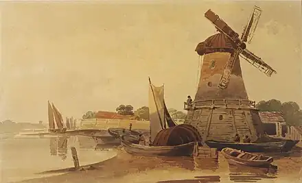 Calvert originally apprenticed in the cotton trade, and he worked as a merchant for a short time "in accordance with the wishes of his friends" before deciding to pursue landscape painting as a career.[18][19] Notices announcing the dissolution of Calvert's cotton merchant partnership with Michael Gibson appeared in newspapers in December 1810; the earliest works attributed to him today date from the early 1810s.[20][21][22] He primarily painted in oils, but occasionally also produced watercolours.[23]