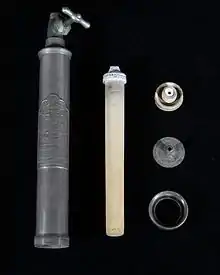 In 1884 he developed a type of filtration known today as the Chamberland filter or Chamberland-Pasteur filter, a device that made use of an unglazed porcelain bar.[1] The filter had pores that were smaller than bacteria, thus making it possible to pass a solution containing bacteria through the filter, and having the bacteria completely removed from the solution.[2] Chamberland was also credited for starting a research project that led to the invention of the autoclave device in 1879.